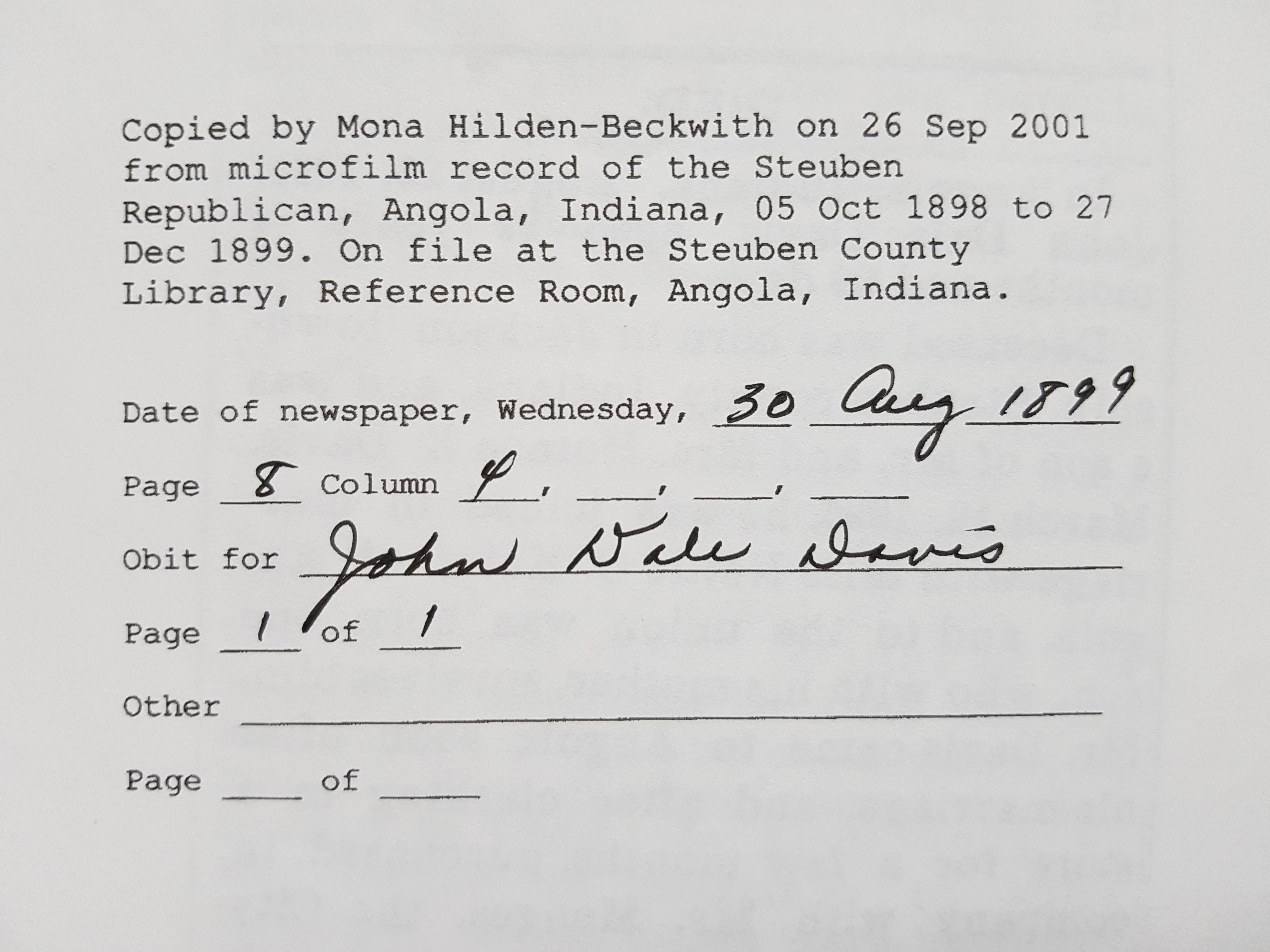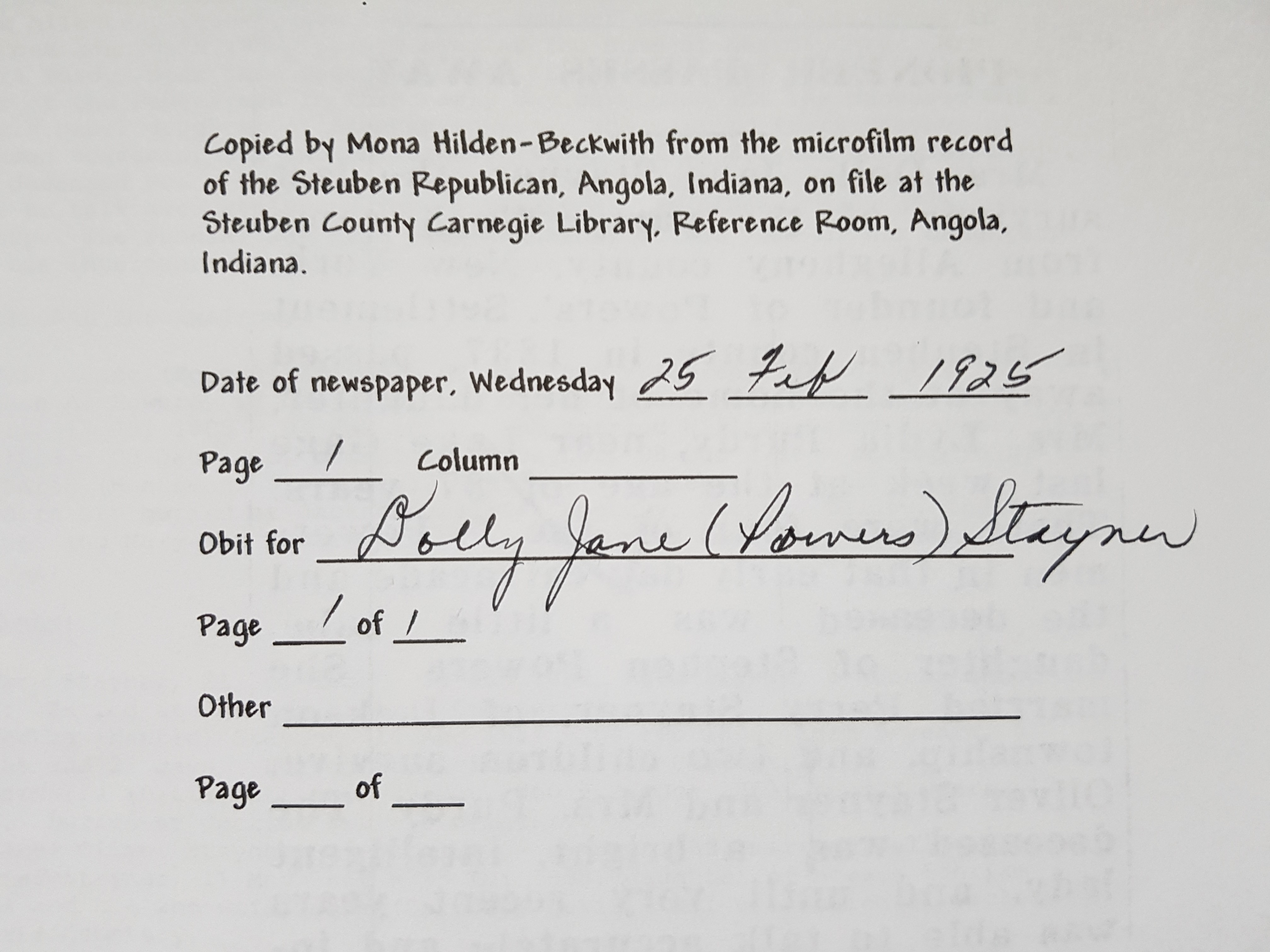 Here are some examples of what her method looks like for an obituary from a newspaper on microfilm: